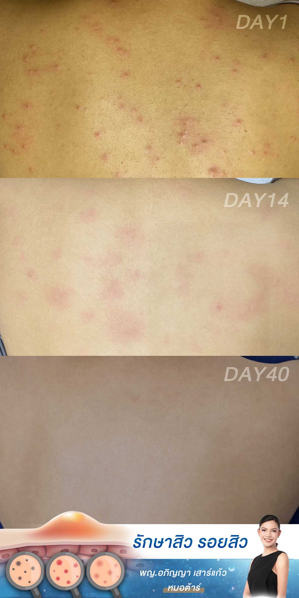 - ระยะสิวหายแล้ว: รอยสิวที่หลัง (รอยแดง/รอยดำ) สีผิวไม่สม่ำเสมอ ผิวดูไม่เนียน