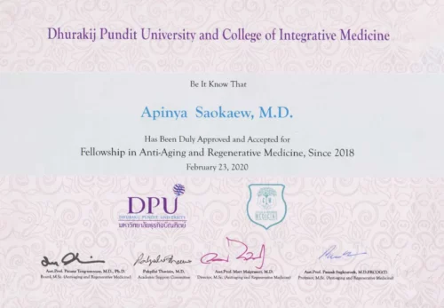 - 2018-2020 Fellowship in Anti-Aging and Regenerative Medicine, Dhurakij Pundit University and College of Integrative Medicine