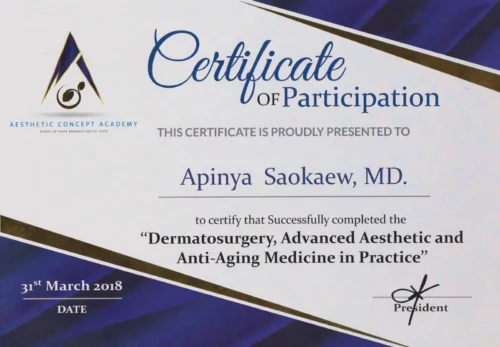 - 2018 Certificate of participation “ Dermatosurgery, Advanced Aesthetic and Anti-Aging Medicine In Practice “ by AESTHETICS CONCEPT ACADEMY