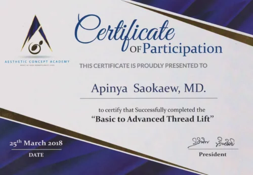 - 2018 Certificate of participation “ Basic To Advanced Thread Lift “ by AESTHETICS CONCEPT ACADEMY