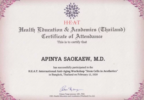 - 2020 has successfully participated in the H.E.A.T. INTERNATIONAL ANTI-AGING WORKSHOP “ Stem Cells in Aesthetics “ by Health Education & Academics (Thailand)