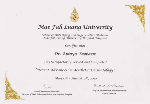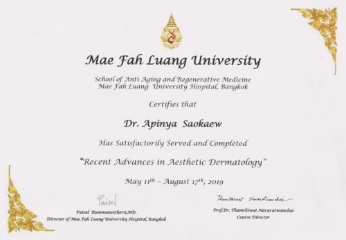 - 2019 has satisfactorily served and completed “Recent Advances in Aesthetic Dermatology” by School of Anti Aging and Regenerative Medicine, Mae Fah Luang University
