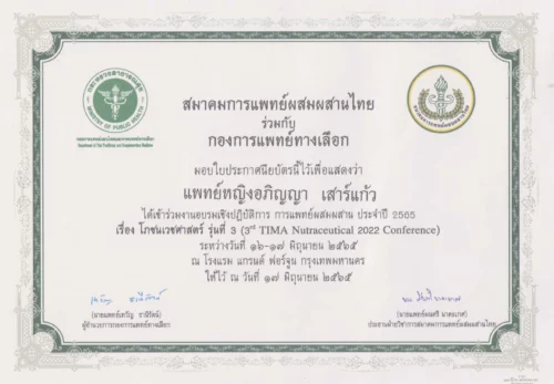 - 2022 เข้าร่วมอบรมเชิงปฏิบัติการ การแพทย์ผสมผสาน เรื่อง โภชนเวชศาสตร์รุ่นที่ 3 (3thTIMA Nutraceutical 2022 Conference)