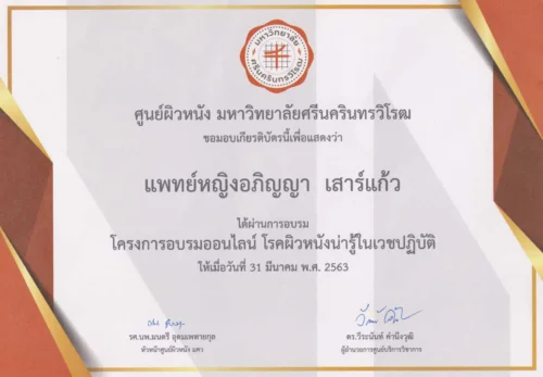 - 2020 ผ่านการอบรม โครงการอบรมออนไลน์ โรคผิวหนังน่ารู้ในเวชปฏิบัติ จากศูนย์ผิวหนัง มหาวิทยาลัยศรีนครินทรวิโรฒ