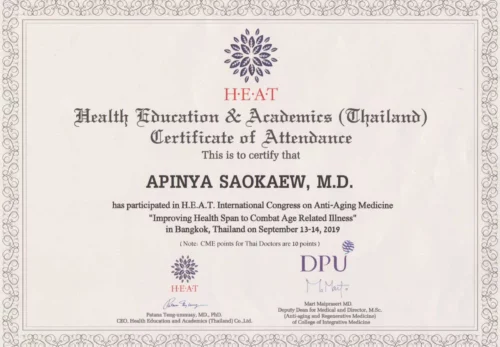 - 2019 has participated in the H.E.A.T. INTERNATIONAL CONGRESS ON ANTI-AGING MEDICINE “Improving Health Span to Combat Age Related Illness” by Health Education & Academics (Thailand)