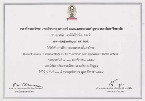 - 2016 ผ่านการอบรมระยะสั้นตจวิทยา “ Common Skin Disease : Truths untold “สาขาวิชาตจวิทยา ภาควิชาอายุรศาสตร์ คณะแพทยศาสตร์ จุฬาลงการณ์มหาวิทยาลัย