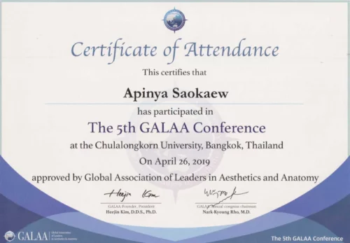 - 2019 has attended THE 9th INTERNATIONAL THAICOSDERM CONGRESS ON AESTHETIC MEDICINE “Catch Up Emerging Innovations In Aesthetic Medicine & Surgery”