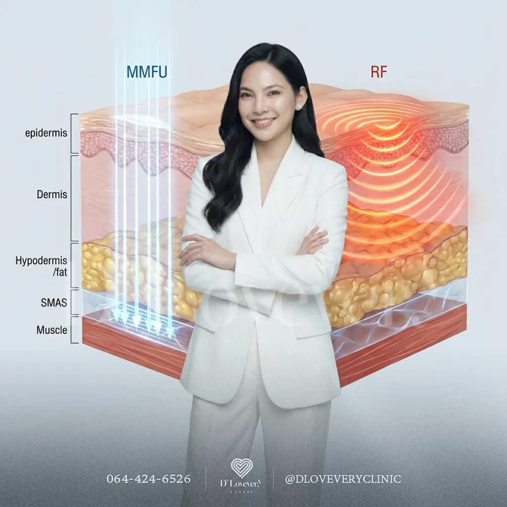 - การทำทรีตเมนต์ด้วยคลื่นวิทยุ (Radiofrequency Treatment): กระตุ้นการสร้างคอลลาเจนและช่วยกระชับผิว ลดความหย่อนคล้อยที่อาจทำให้ใบหน้าดูไม่สมมาตร อาจต้องพักฟื้นเล็กน้อย