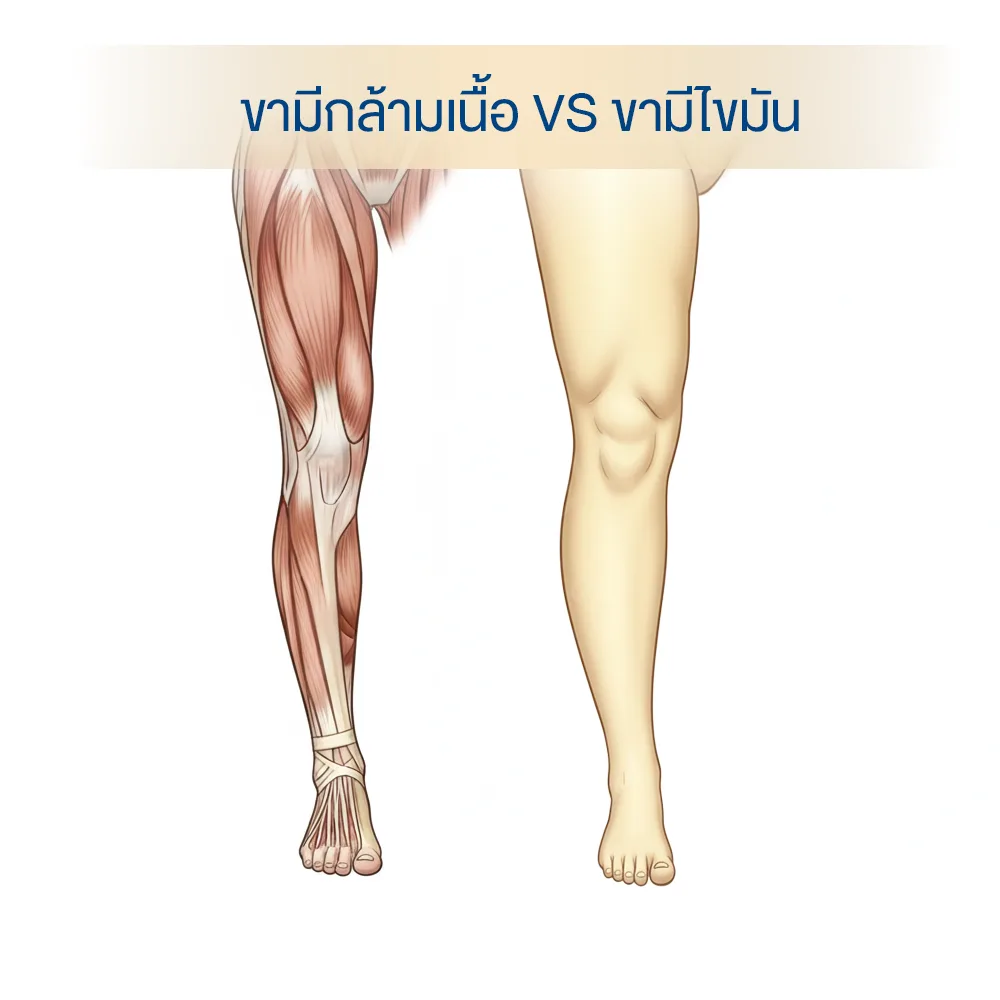 - ขณะยืนปกติ น่องจะดู แน่นตึง และแข็งกว่าขาที่มีไขมัน