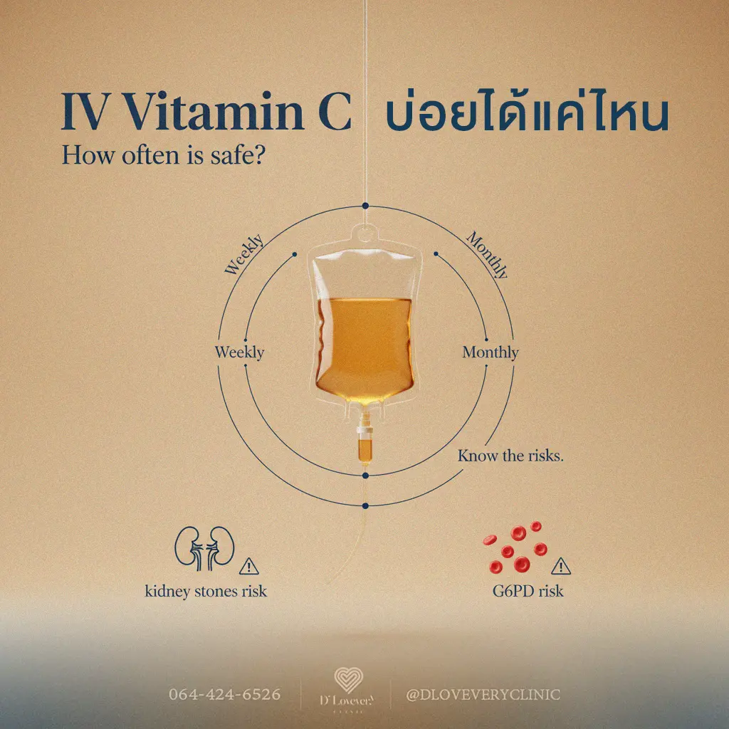 การดริปวิตามินซีเพื่อผิวใสและสุขภาพ ควรทำในความถี่ที่เหมาะสมคือ สัปดาห์ละ 1 ครั้งในช่วงแรก และลดเหลือเดือนละ 1-2 ครั้งเพื่อคงสภาพผิว หากทำถี่เกินไปร่างกายจะขับทิ้งทำให้สิ้นเปลืองเปล่าประโยชน์ ข้อควรระวังสำคัญคือ ความเสี่ยงในการเกิดนิ่วในไต (Oxalate stones) หากดื่มน้ำไม่เพียงพอ และอาจเกิดอันตรายรุนแรงในผู้ป่วยโรค G6PD (ภาวะพร่องเอนไซม์) หรือผู้ที่มีภาวะไตเสื่อม หรือคนไข้ที่ทานวิตามินซีอยู่ ไม่ควรบริโภคเกินวันละ 2,000 มิลลิกรัม