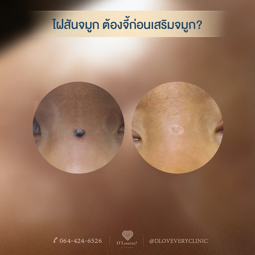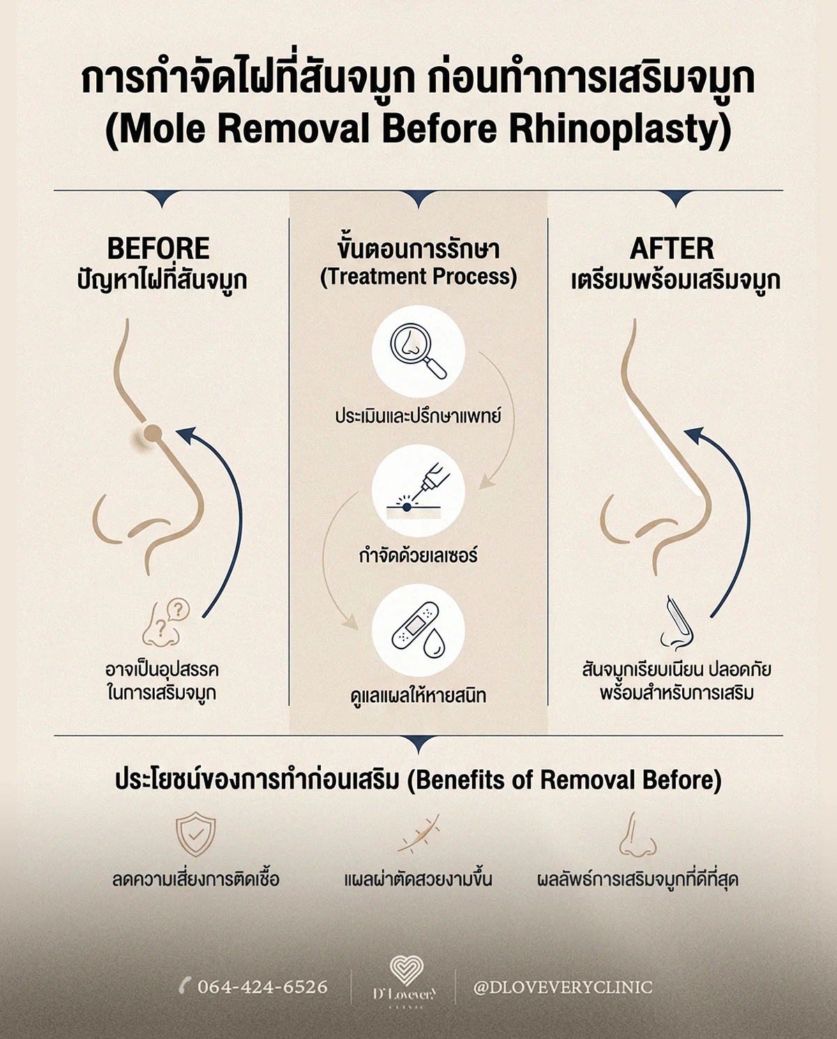 ถ้ามีแผนจะเสริมจมูก แนะนำให้กำจัดออกนะคะ ควรปรึกษาแพทย์เพื่อกำจัดออกก่อนการเสริมจมูก อย่างน้อย 1-2 เดือน เนื่องจากเมื่อเสริมจมูกแล้วผิวจะตึงขึ้นทำให้ ไฝขยายตัวหรือผิดรูป และเพื่อป้องกัน ความเสี่ยงในการติดเชื้อ บริเวณที่วางซิลิโคน การเคลียร์ผิวให้เรียบเนียนก่อนจะช่วยให้ผลลัพธ์การเสริมจมูกออกมา สวยสมบูรณ์แบบและปลอดภัย มากที่สุดค่ะ