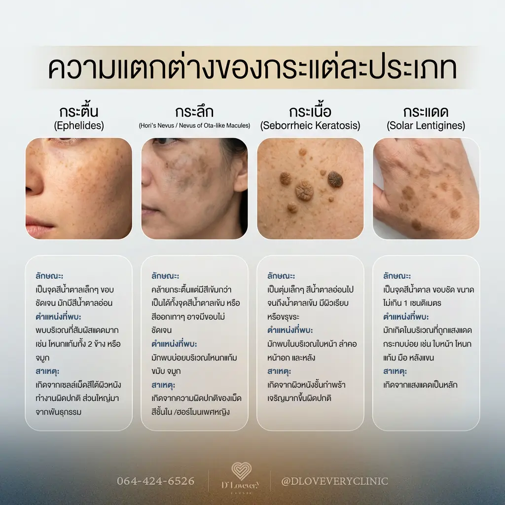 กระแดด (Solar Lentigo) คือร่องรอยของ ความแก่จากแสงแดด (Photoaging) ดังนั้นจุดไหนที่คนไข้ชอบโชว์ผิวท้าแดด จุดนั้นแหละค่ะคือเป้าหมาย หลักๆ ที่หมอพบบ่อยและรักษาได้ ได้แก่