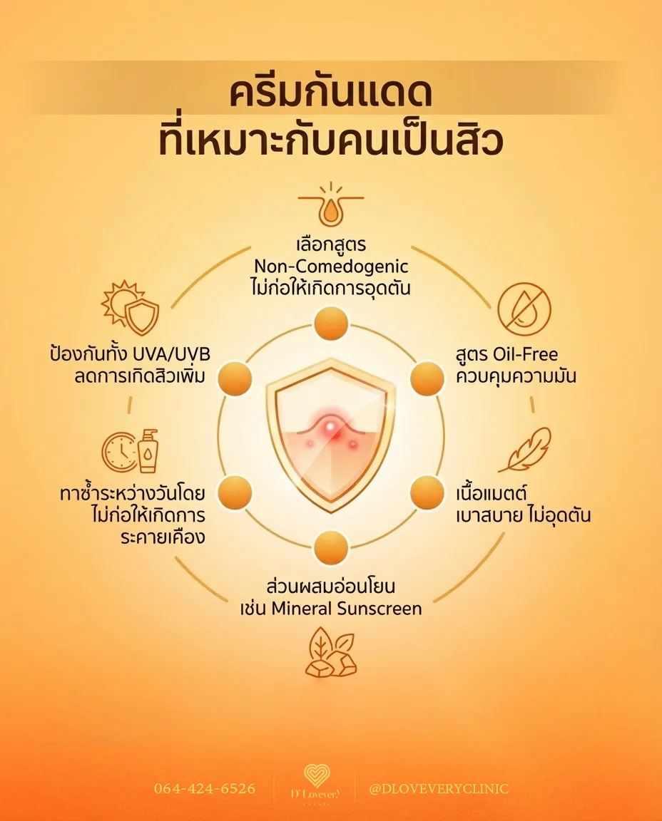 สำหรับคนไข้ที่เป็นสิว หมอแนะนำให้เลือกครีมกันแดดที่ เนื้อบางเบา ไม่อุดตัน (Non-comedogenic) ปราศจาก น้ำหอมและแอลกอฮอล์แรง ๆ ควรมีคุณสมบัติ คุมมัน ลดการอักเสบ และปลอบประโลมผิว เลือกค่า SPF 30–50 และ PA+++ ขึ้นไป ก็เพียงพอ และถ้าผิวแพ้ง่ายหรือมีสิวอักเสบ หมอแนะนำ Physical Sunscreen ที่มี Zinc Oxide จะอ่อนโยนและปลอดภัยกับผิวมากกว่าค่ะ