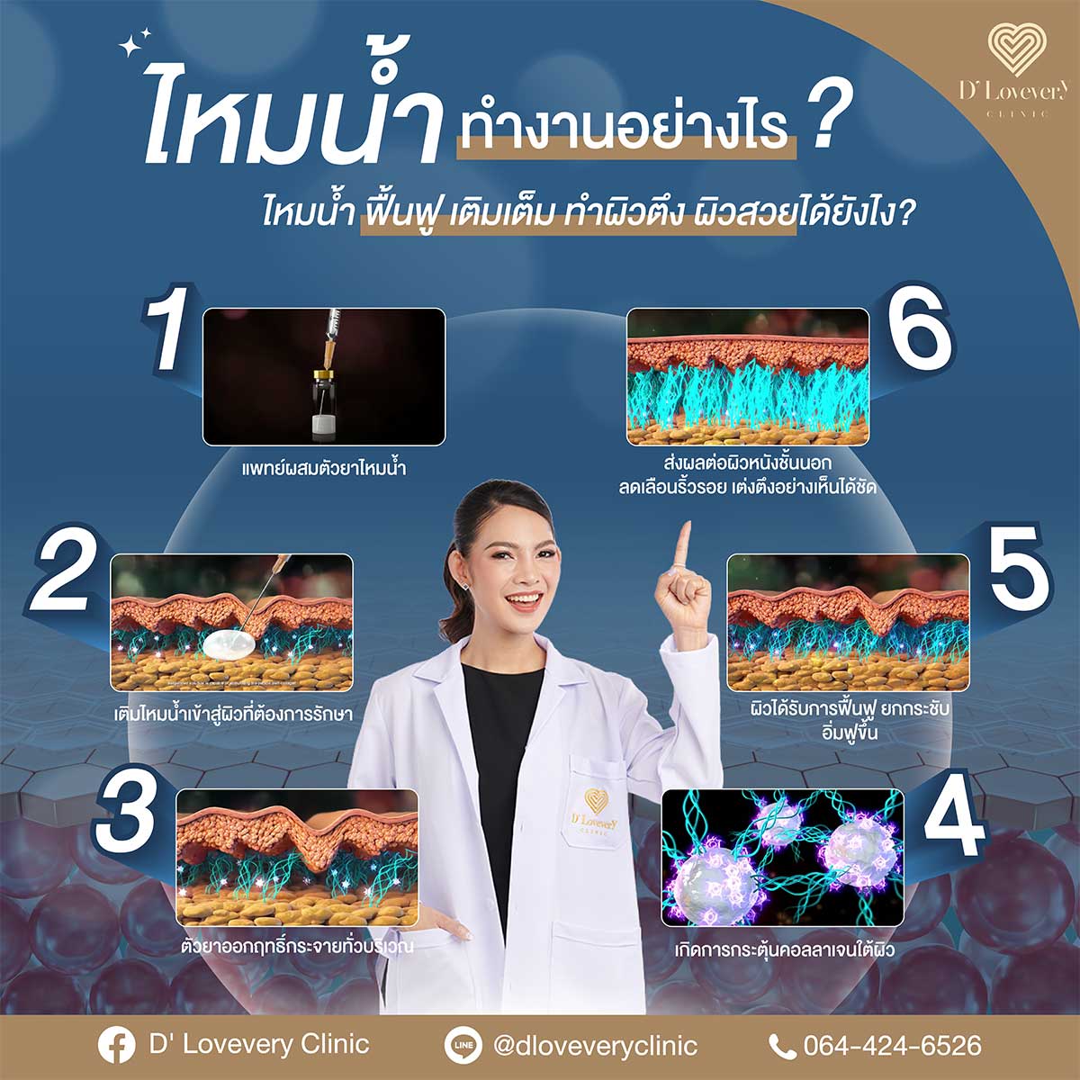 ส่วน “ไหมน้ำ” (Liquid Lift หรือ Biostimulator) ไม่ได้มีเส้นไหมที่เป็นของแข็งจริงๆ นะคะ แต่มันคือ “สารกระตุ้นการสร้างคอลลาเจน” ในรูปแบบของเหลว ที่เราฉีดเข้าไปใต้ผิวค่ะ สารตัวนี้จะกระจายตัวไปใต้ผิวแล้วค่อยๆ กระตุ้นให้เซลล์ผิวของเรา สร้างคอลลาเจนและอีลาสตินขึ้นมาใหม่ด้วยตัวเอง