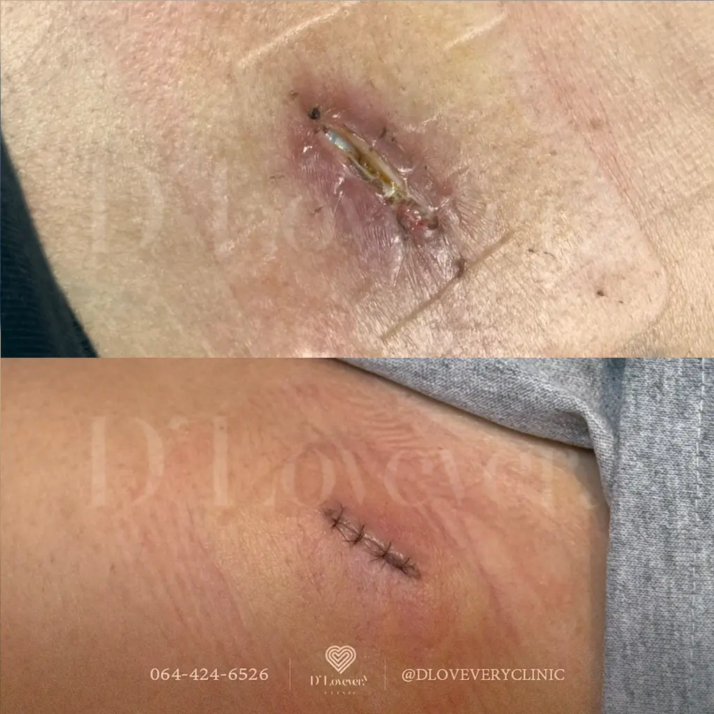 การที่แผลยังปิดไม่สนิททั้งที่ครบกำหนดตัดไหมแล้ว เราต้องระมัดระวังเป็นพิเศษค่ะ หมอแนะนำว่าอย่าเพิ่งตัดไหมก่อนนะคะ ให้คนไข้กลับไปปรึกษาคลินิกที่ทำศัลยกรรม เพื่อให้หมอตรวจดูแผลก่อนค่ะ เพราะหมอเขาจะได้ประเมินสาเหตุและให้การรักษาที่เหมาะสม