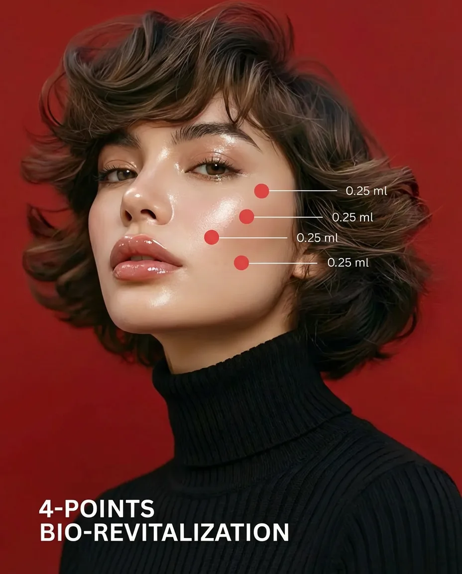 Ejal40 (ผสม Hyaluronic Acid 40mg ใน 2ml) จะให้ผลลัพธ์ที่ดีกว่าเมื่อใช้ร่วมกับเทคนิค 4-Point Bio-Revitalization Protocol (4BRP) ซึ่งเป็นวิธีที่ “จัดตำแหน่งฉีดอย่างแม่นยำ” เพื่อส่งตัวยาไปยังบริเวณที่ผิวต้องการมากที่สุดค่ะ