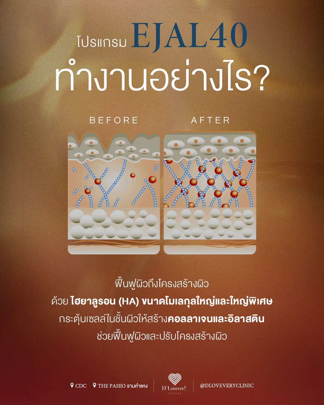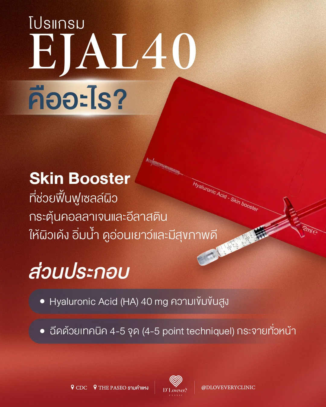 | EJAL40 (1 หลอด / 2 cc) | ฟื้นฟูผิวล้ำลึกด้วย HA 40mg | 9,000 – 15,000.- |