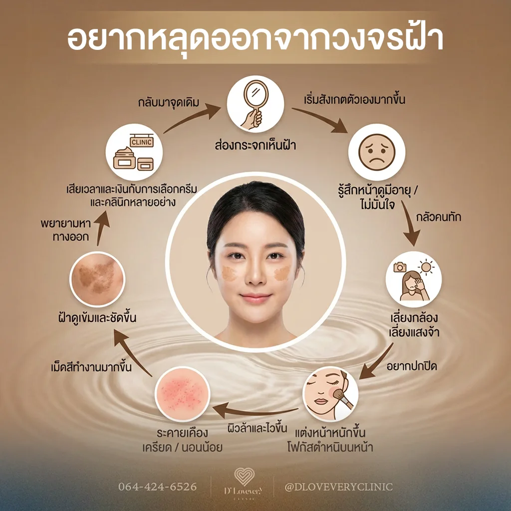 ส่องกระจกเห็นฝ้า → รู้สึกหน้าดูมีอายุ/ดูเหนื่อยกว่าปกติ → ความมั่นใจลดลง → เลี่ยงกล้อง/เลี่ยงแสงจ้า → พยายามปกปิด (แต่งหน้าหนักขึ้น/โฟกัสตำหนิมากขึ้น) → ผิวล้า/ไวขึ้น (ระคายเคือง เครียด นอนน้อย) → ฝ้าดูเข้มและชัดขึ้น → เสียเวลา+เสียเงินกับการเลือกครีม/คลินิก/วิธีรักษาหลายอย่าง → กลับมาส่องกระจกเห็นฝ้าอีกครั้ง → วนซ้ำ