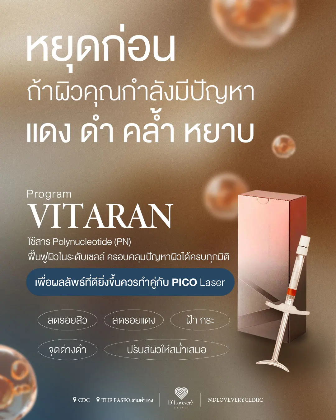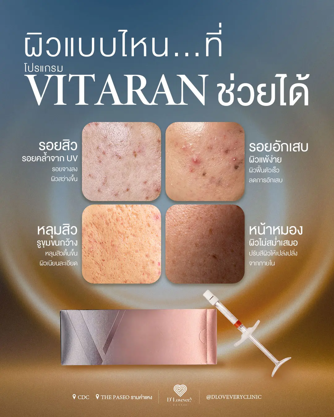 ปัญหาผิวของแต่ละคนมีความแตกต่างกัน การเลือกรับบริการจึงควรพิจารณาจากปัญหาที่แท้จริงเป็นหลัก โปรแกรม Vitaran สามารถเข้ามาช่วยแก้ไขปัญหาผิวได้อย่างตรงจุดในประเด็นดังต่อไปนี้ค่ะ