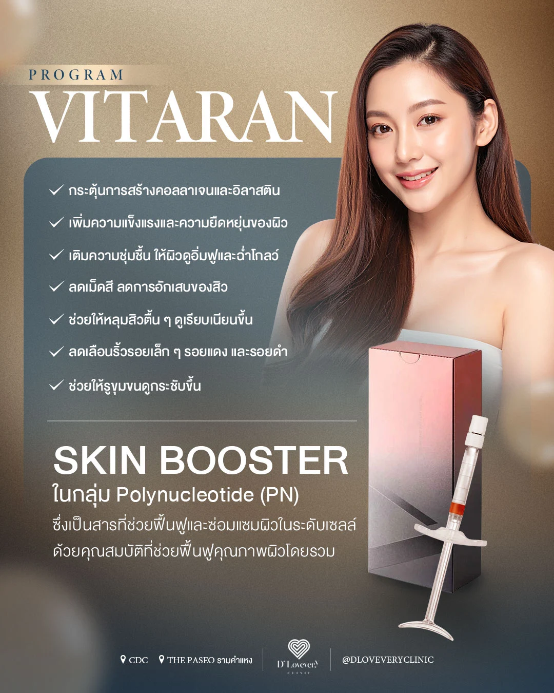 โปรแกรม Vitaran คือ สารฉีดฟื้นฟูผิว (Skin Booster) ในกลุ่ม Polynucleotide (PN) ซึ่งเป็นสารสกัดบริสุทธิ์จาก DNA ของปลาแซลมอนหรือปลาเทราท์ที่ถูกเพาะเลี้ยงในระบบปิดที่ได้มาตรฐานระดับสูง (พัฒนาโดย LG Chem Life Sciences จากประเทศเกาหลีใต้)