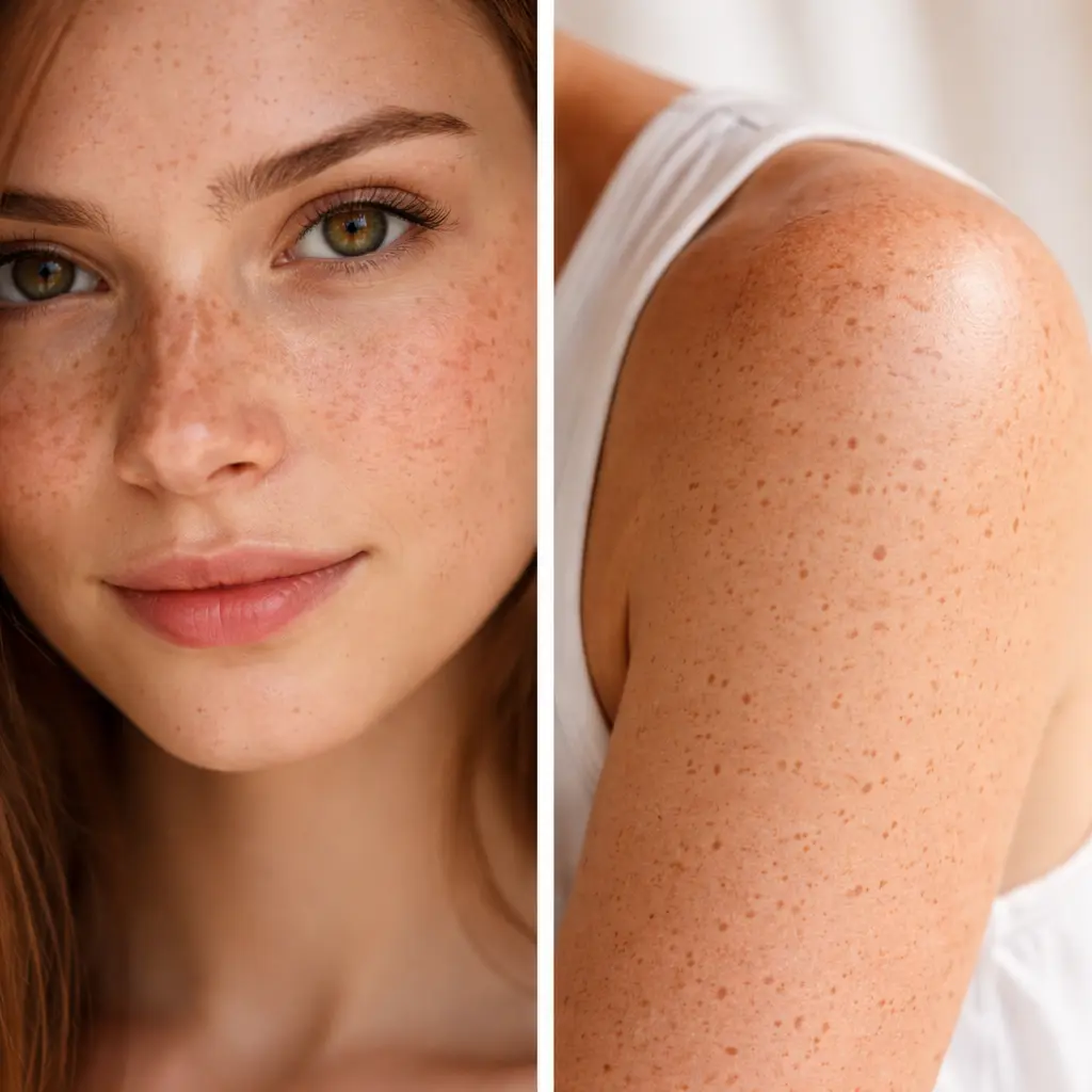 | ประเภทกระที่พบบ่อย | – กระตื้น (Ephelides): จุดสีน้ำตาลอ่อน ขอบชัด – กระแดด (Solar Lentigines): จุดน้ำตาล ขอบชัด ขนาดใหญ่กว่ากระตื้น – กระลึก (Hori’s Nevus): จุดสีเทา/น้ำตาลเข้ม ขอบไม่ชัด – ฝ้า (Melasma): ปื้นใหญ่กว่ากระ มักพบบริเวณโหนกแก้ม หน้าผาก | – กระตื้น (Ephelides): จุดสีน้ำตาลอ่อนเล็กๆ – กระแดด (Solar Lentigines): จุดน้ำตาลชัดเจน มีขนาดและจำนวนเพิ่มตามวัย – กระเนื้อ (Seborrheic Keratosis): ตุ่มนูน สีน้ำตาล/ดำ ผิวหยาบ พบได้บ่อยขึ้นตามอายุ |