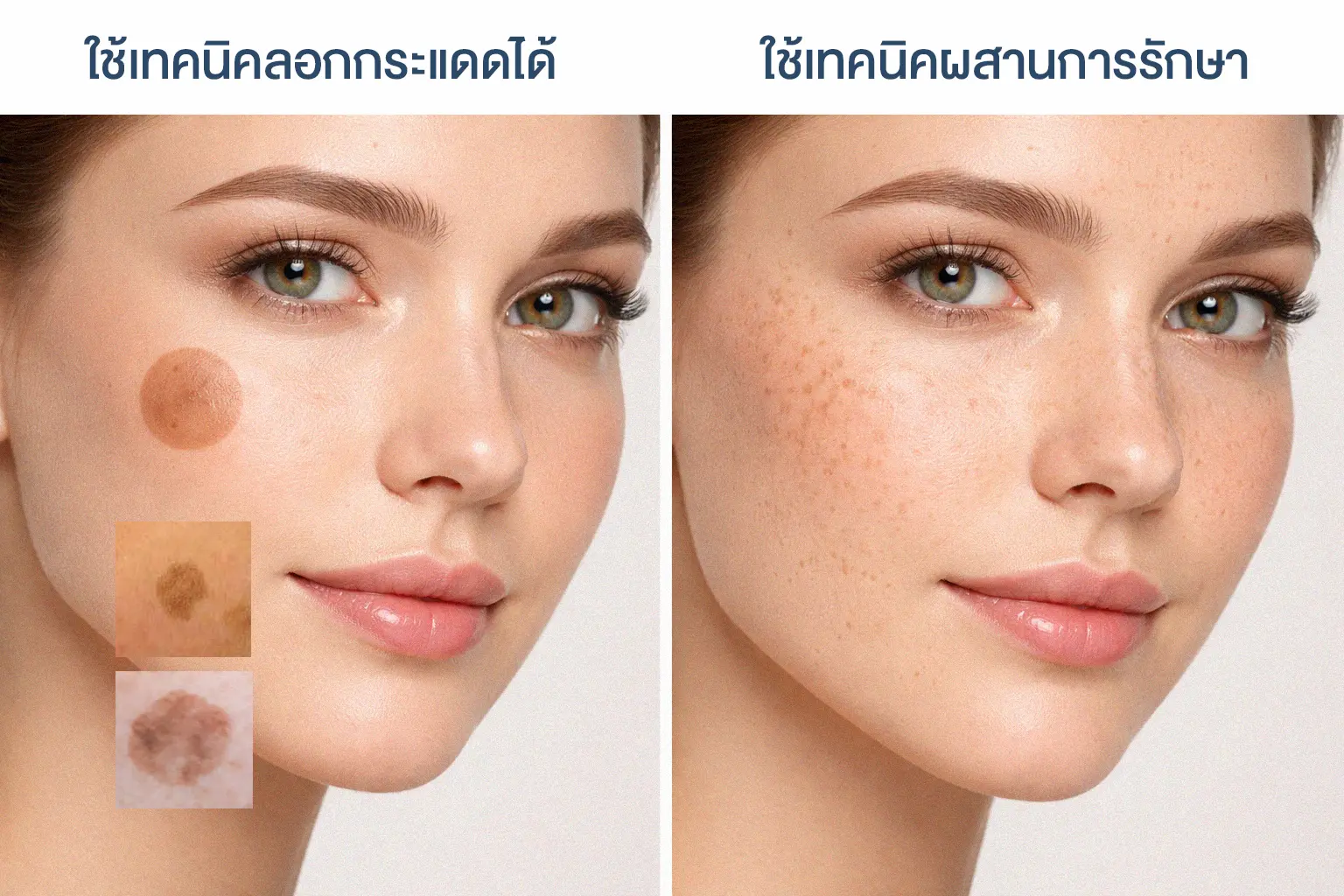 | ประเภทกระที่พบได้บ่อย | – กระตื้น (Ephelides): กระที่เกิดจากพันธุกรรมและแสงแดด – กระแดด (Solar Lentigines): จุดด่างดำจากแดด | – กระแดด (Solar Lentigines): จุดด่างดำจากแดด – กระลึก (Hori’s Nevus / Nevus of Ota-like Macules): กระที่มีเม็ดสีอยู่ในชั้นที่ลึกกว่า – ฝ้า (Melasma): มักพบร่วมด้วย |