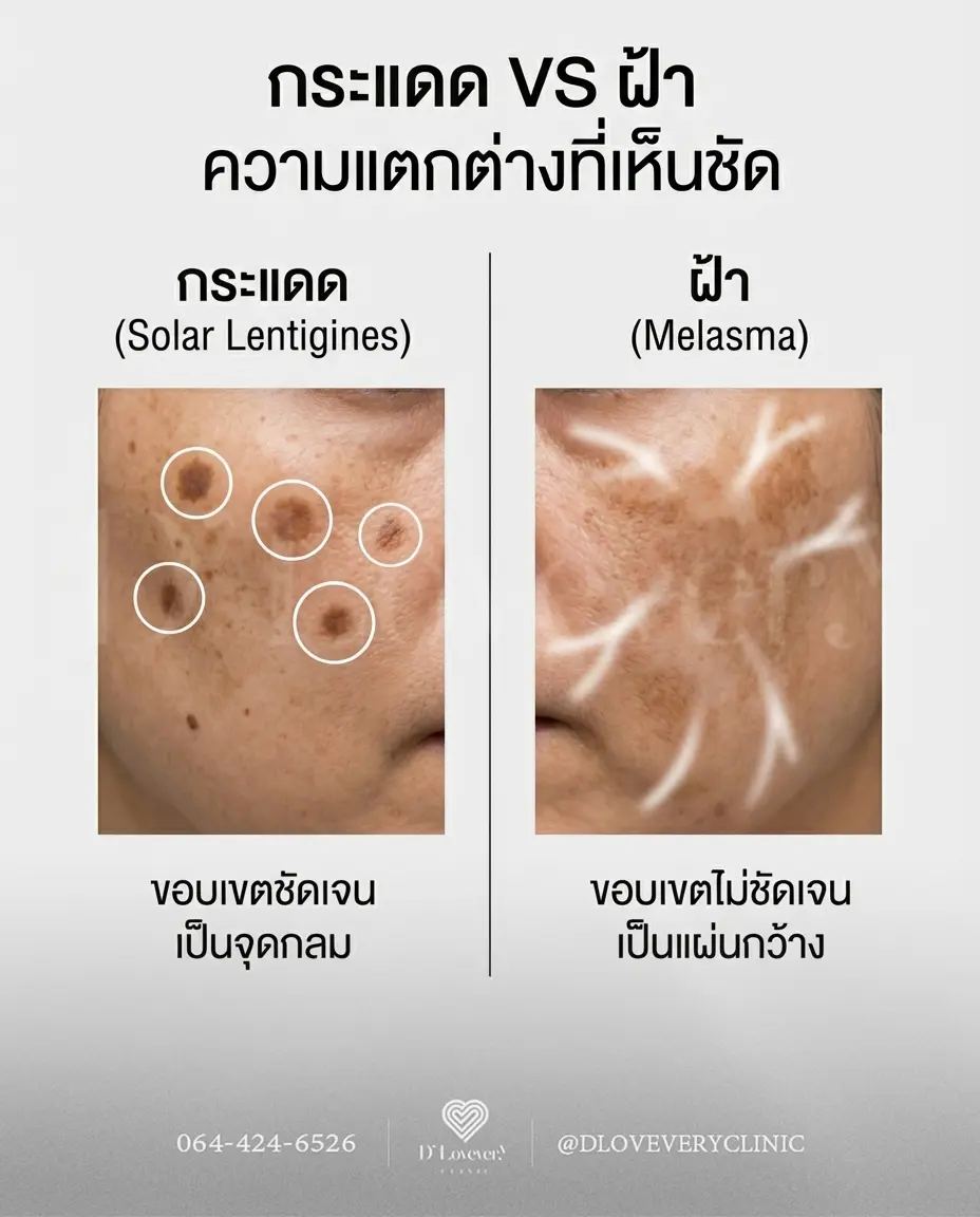 - ฝ้าไม่ได้มาเดี่ยวๆ แต่เกี่ยวพ่วงกับ “เส้นเลือด” : สังเกตไหมคะว่าคนเป็นฝ้ามักจะหน้าแดงง่ายเวลาเจอแดด นั่นเพราะใต้พื้นผิวที่มีฝ้า มักจะมี เส้นเลือดฝอย จำนวนมากที่คอยส่งอาหารมาเลี้ยงเซลล์สร้างเม็ดสี ทำให้ฝ้าผลิตสีดำออกมาไม่หยุด (นี่คือเหตุผลที่เรียกว่า ฝ้าเลือด)